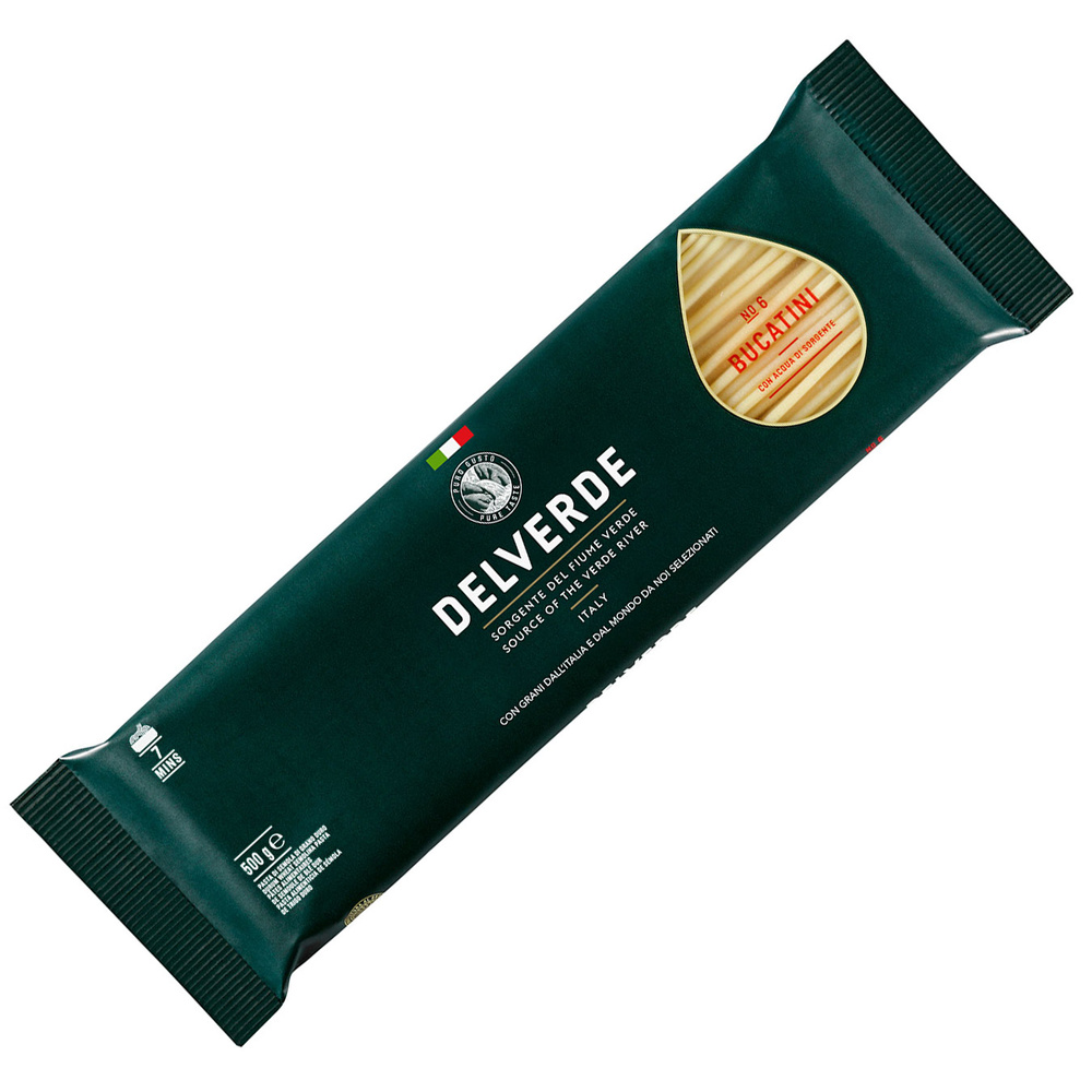 Bucatini to makaron w kształcie nitek grubszych niż klasyczne spaghetti. Przez środek każdej nitki przechodzi niewielka dziurka, która jest charakterystyczną cechą makaronu Bucatini. Włoski makaron Delverde produkowany na matrycach z brązu to połączenie wyłącznie dwóch składników: semoliny z pszenicy durum i najczystszej wody źródlanej. Chropowata powierzchnia doskonale wpływa na połączenie się makaronu z sosami. Ten kształt pasty najczęściej podaje się z takimi składnikami jak jajka, ser, anchois i sardynki. Bucatini doskonale smakuje serwowany z sosem all’Amatriciana.